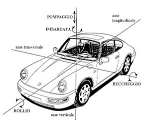 L’interazione fra i vari gruppi sospensivi, genera una serie di moti della scocca rispetto alla ruote che sono di particolare interesse per la definizione del comportamento del veicolo. I più importanti di questi movimenti per il comportamento dinamico del veicolo sono il rollio e il beccheggio. Il pompaggio, ovvero l’oscillazione secondo un asse verticale mantenendo la scocca parallela al terreno, è un moto che si può considerare come un caso particolare di beccheggio (una sorta di beccheggio simmetrico), mentre il moto di imbardata ovvero la rotazione attorno ad un asse verticale è una specie di sterzata che è legata all’aderenza dei pneumatici e alle dimensioni caratteristiche del veicolo (passo, carreggiata). Tutte le forze che tendono a muovere la scocca si realizzano perché i pneumatici a contatto con il terreno offrono delle reazioni vincolari analizzando le quali è possibile determinare i moti ai quali è sottoposta la scocca. Un parametro fondamentale per l’analisi dei moti è la posizione del baricentro.