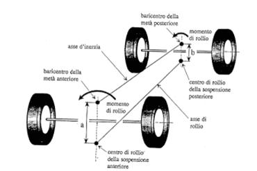 Quando si entra in curva si osserva come, a causa della forza centrifuga le masse subiscono un movimento analogo a quello di un pendolo, con l’unica differenza che il centro di rotazione in questo caso si trova più in basso delle masse sospese. Questo punto virtuale si può determinare graficamente in funzione del tipo di sospensione. La posizione può variare non solo in base al tipo di sospensione adottata all’avantreno o al retrotreno, ma anche dall’escursione di esse. Di solito in un’autovettura gli schemi sospensivi sono diversi fra l’anteriore e il posteriore e quindi la posizione dell’asse di rollio (ovvero la congiungente fra il centro di rollio anteriore e il centro di rollio posteriore) determina l’asse virtuale intorno al quale il veicolo ruota durante il movimento. L’asse è detto virtuale in quanto esso può variare la sua posizione durante le escursioni delle sospensioni, così come variano i rispettivi centri di rollio.