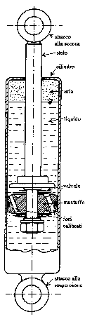 L'ammortizzatore è una sistema che, attraverso un movimento lineare, produce un attrito fra le molecole di un mezzo viscoso producendo calore. Tutti gli ammortizzatori utilizzano un meccanismo semplicissimo: un pistone scorre all'interno di un tubo riempito di fluido. Analizziamo per semplicità un ammortizzatore idraulico telescopico: onde permettere il moto il pistone deve essere forato, in modo che l'olio possa defluire da una parte all'altra, offrendo nel contempo una certa resistenza. Nel pistone esistono due tipi di fori, un tipo rimane sempre aperto e si occupa dei piccoli movimenti, l'altro tipo è chiuso mediante valvole che si aprono diversamente lasciando passare una maggiore o minore quantità d'olio, sulla base della pressione esercitata dal pistone nel suo movimento. I fori che rimangono sempre aperti si occupano dei movimenti lenti prodotti dalla massa sospesa soggetta al rollio o al beccheggio. I fori dotati di valvole si occupano invece dei grandi movimenti e soprattutto di quelli veloci. La taratura di piccoli movimenti controlla la massa sospesa, mentre quella dei grandi movimenti controlla la massa non sospesa, ovvero le sospensioni. Il lavoro prodotto da questo pistone, che si muove attivando la viscosità dell'olio, deriva da un grande attrito, che si traduce in una grande produzione di calore (temperature dell'olio superiori ai 150°C). Il risultato che si ottiene riguarda le proprietà fisiche dell’olio, che diventata quindi molto fluido riducendo l'effetto dell'ammortizzatore stesso, fino ad arrivare all’ebollizione, con la formazione di bolle d'aria che mischiate all'olio arrivano ad annullare l'effetto stesso dell'ammortizzatore visto che l'aria non incontra nessuna resistenza nel passare attraverso le valvole. Il problema fu risolto, osservando come un liquido non completamente diseareato arrivi all’ebollizione quando la tensione di vapore diventa uguale alla pressione esterna: per evitare l'ebollizione sarebbe bastato quindi aumentare la pressione. Fu così introdotto all'interno dell'ammortizzatore del gas sotto pressione separandolo dall'olio per mezzo di un diaframma. Di norma esiste una differenza di taratura fra estensione e compressione, incontrando infatti una buca la molla deve potersi comprimere quasi immediatamente, onde non trasmettere al telaio l'urto. Se la taratura fosse troppo elevata la molla ovviamente non potrebbe lavorare ed il risultato sarebbe un gran colpo ai punti di montaggio della sospensione. Assorbito il colpo se la molla si scaricasse con la stessa velocità con cui si è caricata provocherebbe come poi un ribalzo pari al colpo ricevuto; il sistema dovrà pertanto scaricarsi molto lentamente. Il rapporto migliore risulta essere quattro ad uno per auto di serie, due ad uno per ammortizzatori da corsa e tre ad uno per ammortizzatori da rally.