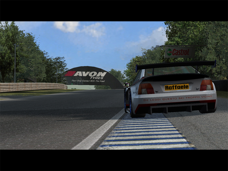 La curva a destra infondo al rettilineo prinicipale l'avete fatta bene se la state percorrendo intorno ai 130-136 km/h, velocità molto inferiori segnalano che avete un mezzo troppo sottosterzante, mal bilanciato che con il muso punta la tangente della curva, in tal caso sono da rivedere campanature gomme e trasmissione anche se il primo pensiero per abitudine porta alle ali. Generalmente si tratta delle ali solo in caso di errori MACROSCOPICI DI MESSA A PUNTO. Lo spazio di uscita dalla curva è notevole ed il cordolo abbondantemente percorribile. Se ne avete di più, lasciate scorrere il telaio e non chiudetelo a centro curva. Occhio a non esagerare, il testa coda per differenza di grip asfalto/erba è in agguato. |