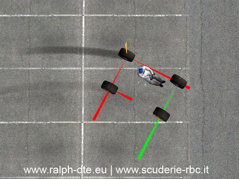 Percorrenza. Durante la percorrenza dell'anello dello skid pad è possibile accorgersi, tramite l'analisi dei vettori, di come si distribuiscono le forze sulle quattro ruote. E' possibile rendersi conto della velocità alla quale la tenuta di strada cala drasticamente lasciando scivolare il veicolo lungo la tangente alla curva. Inoltre è possibile accorgersi di eventuali squilibri del veicolo (carichi troppo elevati all'anteriore o al posteriore) e correggerli ad esempio tramite la regolazione dell'altezza da terra della vettura sull'assale anteriore e su quello posteriore. |